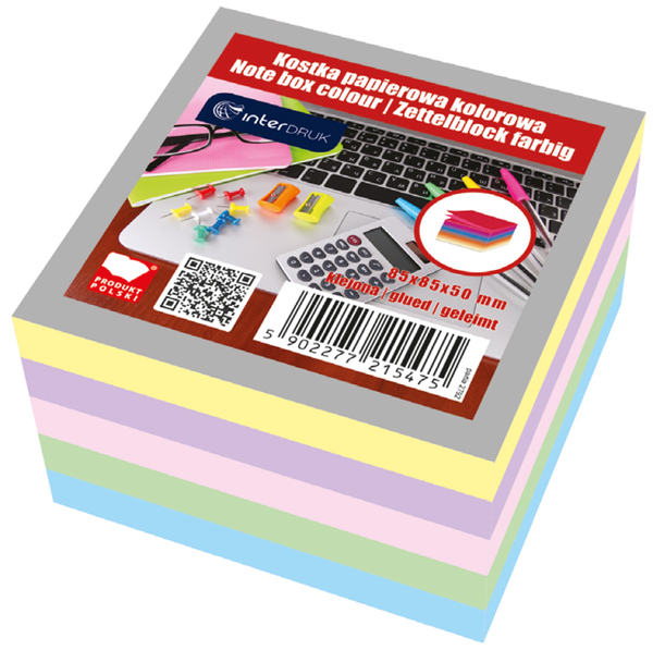 Bloczek kartek kolorowych w pojemniku 85x85x35mm, Interdruk