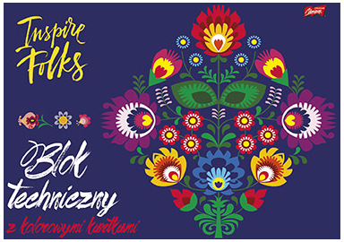 Blok zawiera 10 kolorowych kartek o gramaturze 160 g/m2. Kartki barwione w masie w kolorach żółty, łosoś, różowy, pomarańczowy, fioletowy, czerwony, jasnozielony, ciemnozielony, jasnoniebieski, ciemnoniebieski. Okładka kredowa o gramaturze 115 g/m2 wykorzystuje najnowsze motywy wzornicze UNIPAP. Dla podkreślenia, jakości wykończenia okładka jest dodatkowo nabłyszczana. Całość usztywniona tekturowym podkładem. Format – A3 Ilość kartek – 10 Gramatura papieru – 160 g/m2