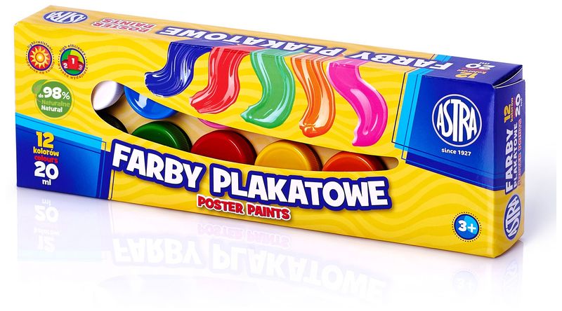 Farby plakatowe Astra stworzone z myślą o malowaniu na papierze, kartonie, drewnie, nieglazurowanej ceramice i kamieniu.Kryjące farby wodorozcieńczalne są bardzo wydajne i zapewniają czyste i intensywne barwy.Dzięki zastosowanej technologii są odporne na ścieranie i działanie światła.