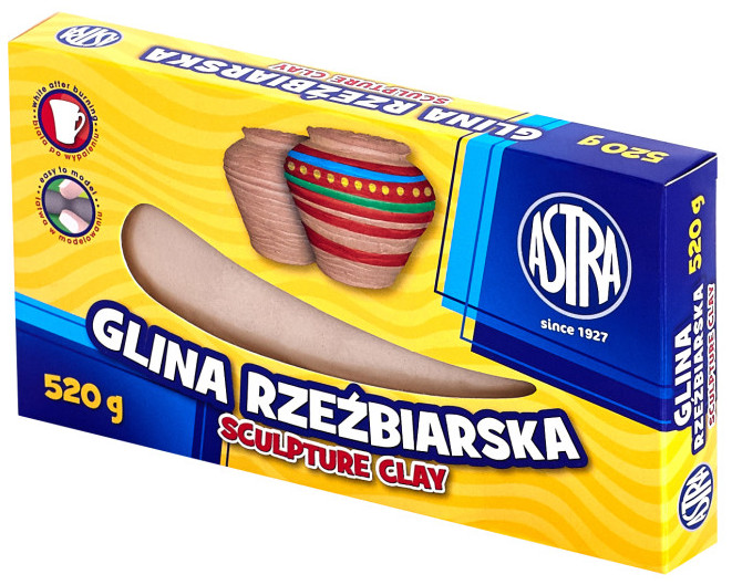 Glina rzeźbiarska Astra 520g. Glina rzeźbiarska idealna do modelowania, lepienia, odciskania i odlewania w formach gipsowych. Można poddawać ją procesowi wypalania w temperaturze 850-1200 stopni. Po wysuszeniu glinę można malować farbami.