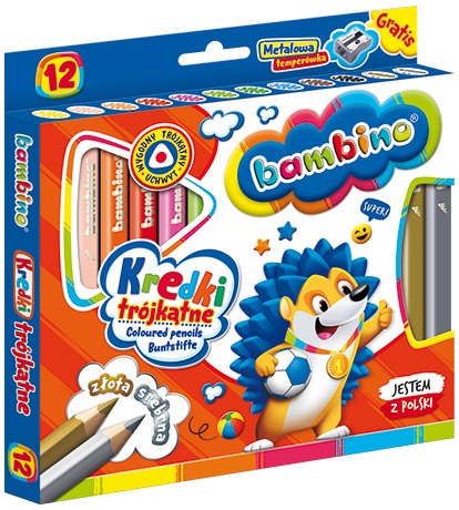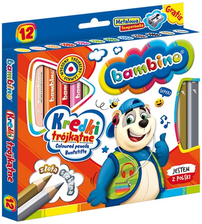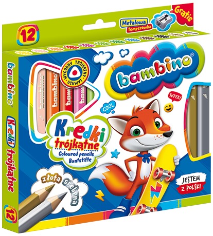 Cechy produktu: wykonane z glinki kaolinowej w drewnianej oprawie o wygodnym trójkątnym przekroju produkowane w Polsce łatwe do temperowania miękkie w użyciu intensywne i nasycone kolory doskonale kryją powierzchnię idealne do rysowania, wypełniania dużych płaszczyzn i wykonywania miękkich przejść pomiędzy kolorami grube, odpowiednio wyważone, przez co idealnie dopasowują się do małej dłoni dziecka odpowiednie dla dzieci 3+ spełniają wymagania zasadnicze dyrektywy Parlamentu Europejskiego i Rady 2009/48/WE z dnia 18 czerwca 2009 w sprawie bezpieczeństwa zabawek oraz wymogi odpowiednich norm zharmonizowanych 12 kolorów temperówka w zestawie w zestawie złota i srebrna kredka Specyfikacja produktu: Przekrój kredki – 10 mm Długość kredki – 15 cm Średnica pręcika – 5,3 mm
