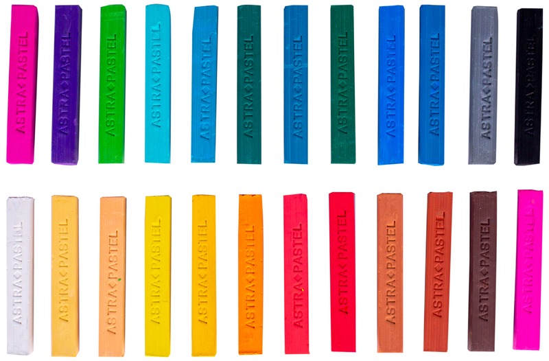 Pastele suche Astra prestige 24 kolory. Wykonane z wysokiej jakości surowców: pigmentów zmieszanych z najlepszej jakości glinką kaolinową. Służą do rysowania cienkich linii, delikatnych śladów lub do malowania szeroką smugą. Można je rozcierać i nawarstwiać uzyskując delikatne przejścia pomiędzy barwami. Struktura pastel, szeroka paleta barw oraz wyrazistość kolorów pozwala uzyskać aksamitną gładkość i ciekawe efekty wizualne. Pastele suche są pylące, dlatego prace należy utrwalić fiksatywą
