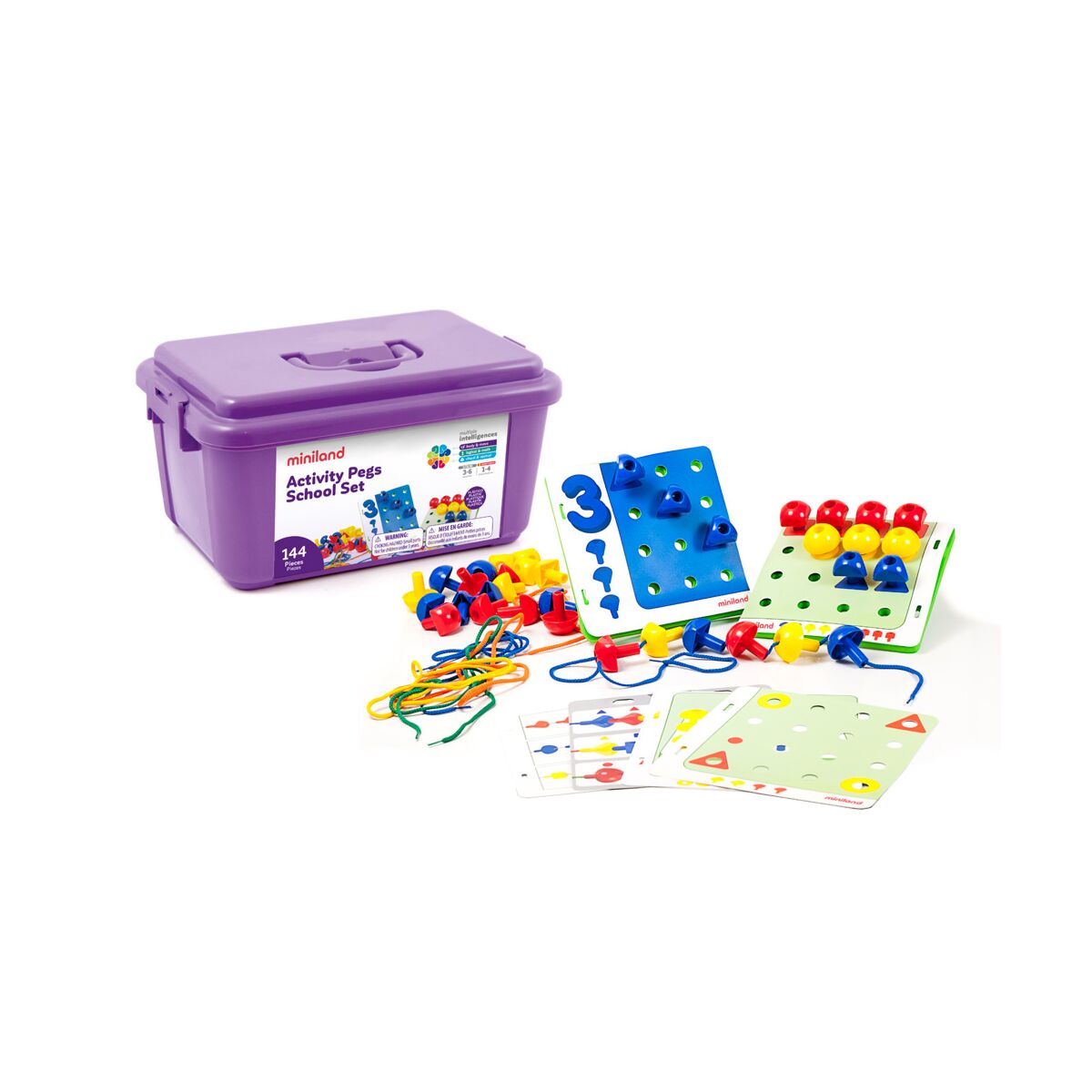 Zestaw pinezek Miniland (ang. Activity Pegs) to rozbudowany zestaw edukacyjny, który pomaga dzieciom rozwijać logiczne myślenie, koncentrację oraz zdolności manualne. Zadaniem dziecka jest układanie kolorowych pinezek na planszy zgodnie z kartami wzorów lub tworzenie własnych układów.