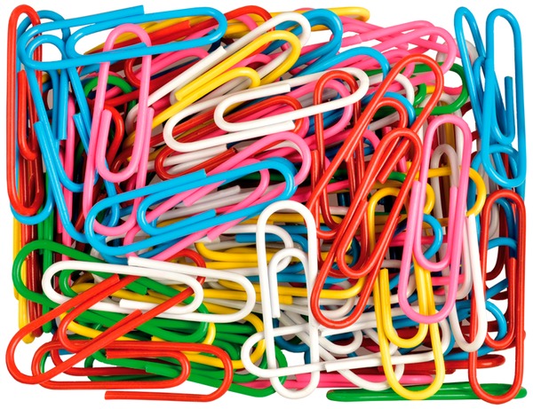 Spinacze biurowe wykonane ze stali nierdzewnej pokryte kolorowym plastikiem. Okrągły kształt.