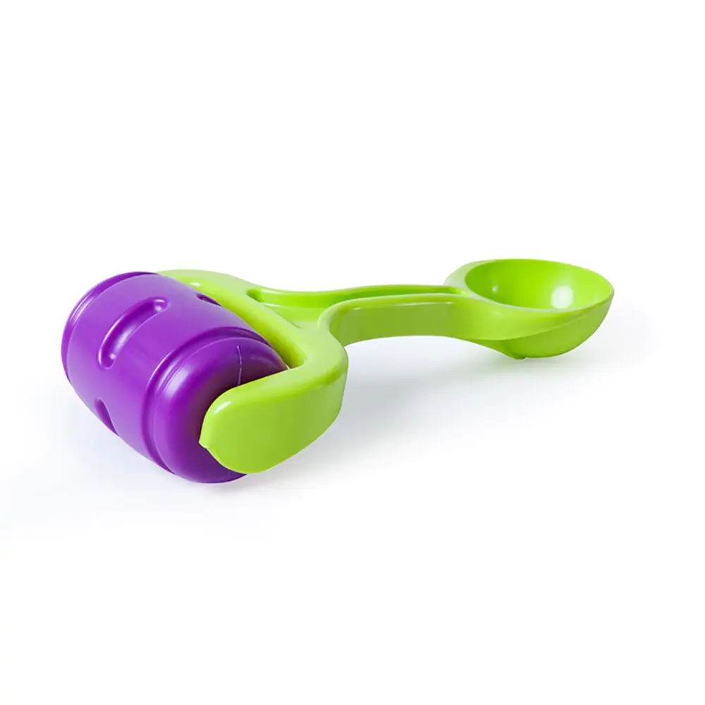 Wałek ze wzorem pasów jezdni do tworzenia własnych dróg w zabawie na piasku, czy też śniegu. Na trzonku foremka w kształcie kulki.