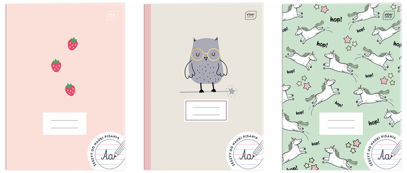Zeszyty w formacie A5 lub A4. Okładki zabezpieczone błyszczącym lakierem. Zaokrąglone rogi (A5) lub ostre narożniki (A4). Modny design, duża różnorodność wzorów.